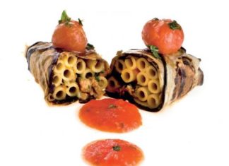 5 ricette con le melanzane: Cannelloni di melanzane - crema a strati di melanzane, cipolle e avocado - Involtini di melanzane in umido con purè ai capperi ed erba cipollina - Orecchiette con melanzane in umido alle acciughe e pinoli - Tortino di melanzane alla mediterranea