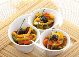 5 ricette con i peperoni: Insalata di peperoni e baccalà - Marinata ai tre peperoni con olive al forno - Peperoni farciti con riso e seitan alle erbe aromatiche - Peperoni sottolio con capperi e acciughe - Peperonata fritta in agrodolce