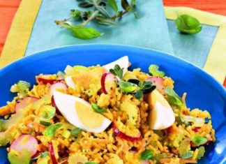 5 ricette con la senape: Crostata integrale ai pomodori - Insalata di fagioli, fagiolini e pomodori - Insalata di riso con ortaggi alla senape - Sgombri saporiti con cipolle e senape - Muffin rustici con funghi, scalogni e senape