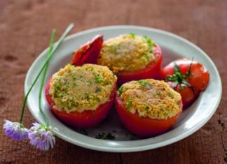 5 ricette con i pomodori: Dadolata di tofu ai 4 pepi con pomodorini e capperi - Millefoglie di carasau e pomodori con crema di pinoli - Pomodori farciti alla provenzale - Spiedini vegetariani con dadolata di pomodorini - Zuppa di pomodoro al rosmarino